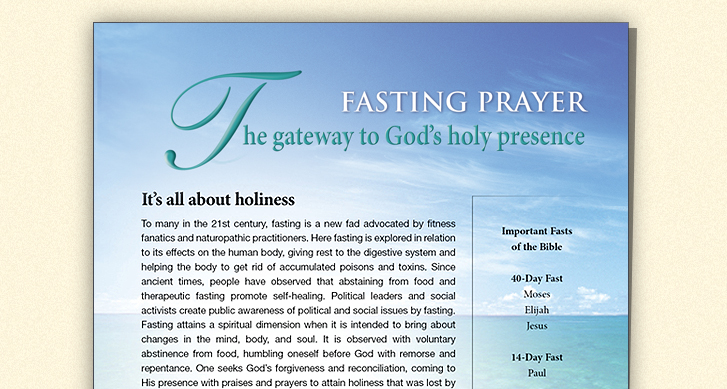 Individual fasts and corporate fasts undertaken at different times of Biblical history with different goals and durations are the beacons of this feature. The principles to be obeyed and observed in a fasting prayer are defined clearly to gain entry into God's holy presence.