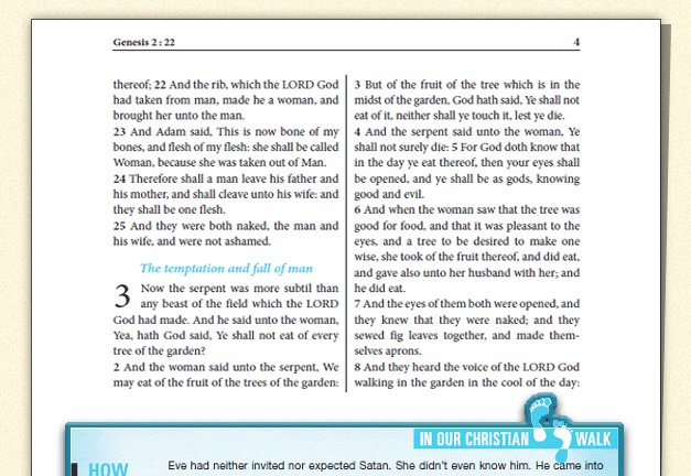 “In your Walk with Christ” is a feature throwing light on the challenges and struggles faced in our walk with Christ. These devotionals will guide, encourage, empower, and enlighten us in our Christian journey. There are over a 115 life-changing devotionals distributed throughout the Christian Walk Bible illuminating the path of our Christian walk. |