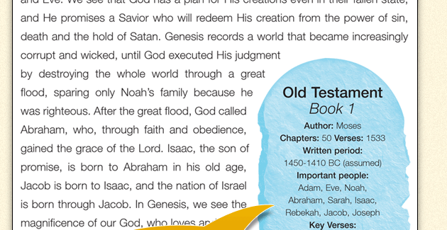 Each synopsis displays a tablet, containing statistics such as the number of chapters and verses, the period of writing, key verses and characters in the book. |